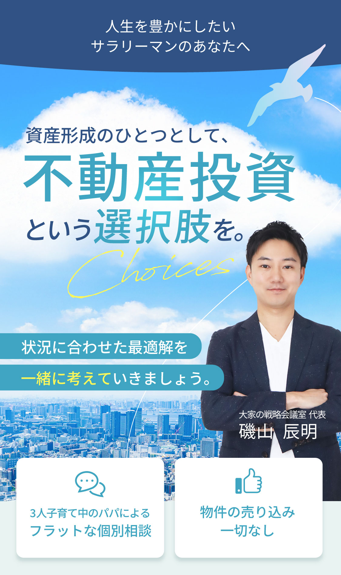 サラリーマンや複業を目指す方々に向けた不動産投資のアドバイス・サポートを行います。
